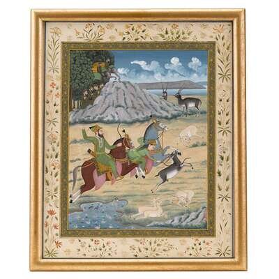 Depicting a prince and lady on horseback hunting gazelle and deer, framed and glazed.