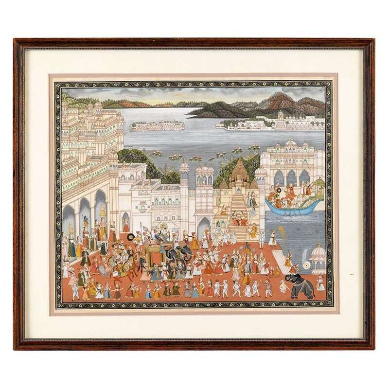 Depicting an elaborate ceremony in a waterside palace courtyard, with numerous dancing figures and processioners surrounding a maharaja on a caparisoned elephant, laid down, matted framed and glazed.