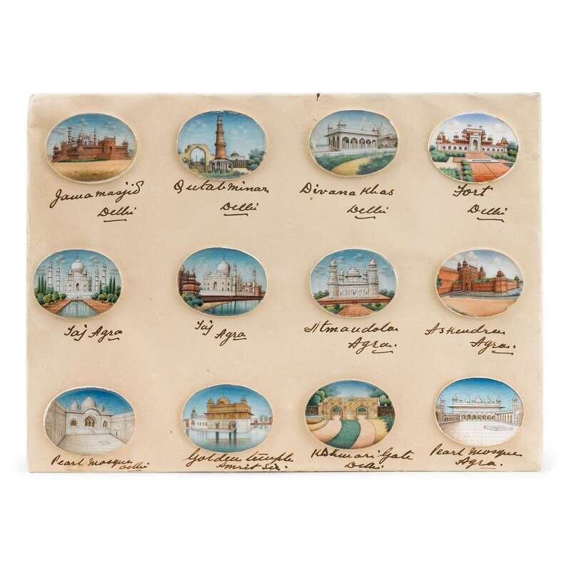 Comprising twelve oval form miniatures depicting various architectural monuments in Agra and Delhi including the Jama Masjid, Qutb Minar, Diwane Khaas, the Red Fort, Taj Mahal, the Pearl Mosque and others, each with glass cover, all mounted and labeled on cardboard panel, with old retailer's label on verso.