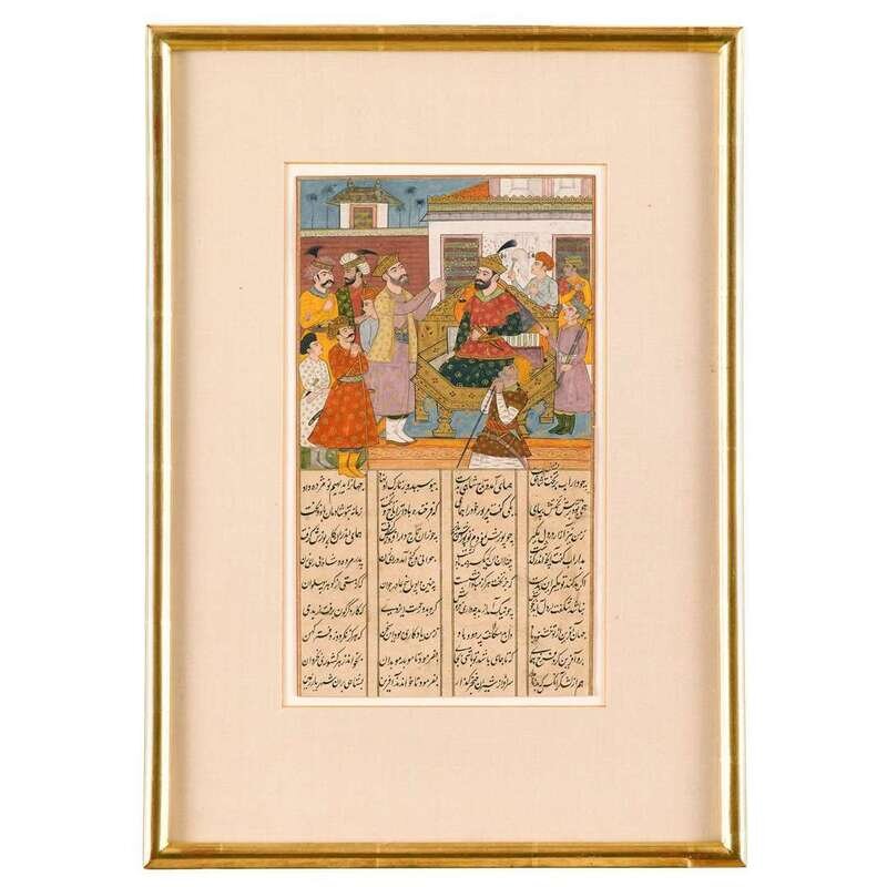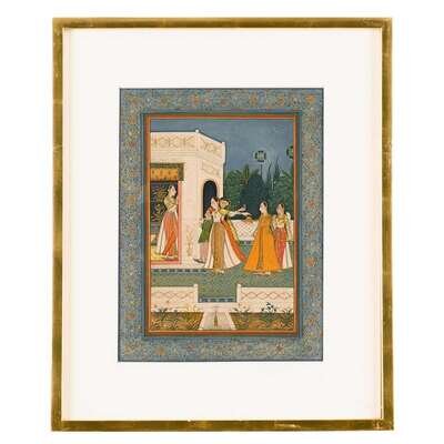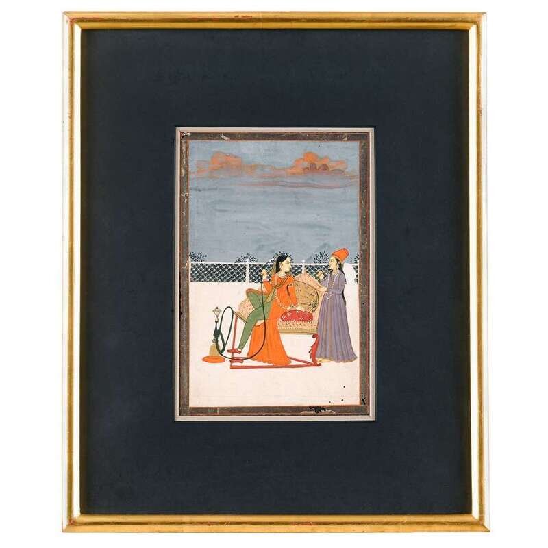 Comprising a miniature depicting a princess observing her attendants rehearse a short play, a miniature depicting the maharajah receiving tribute from his emissary above four columns of text, and a Jaipur miniature depicting a female smoking a hookah. (3).
