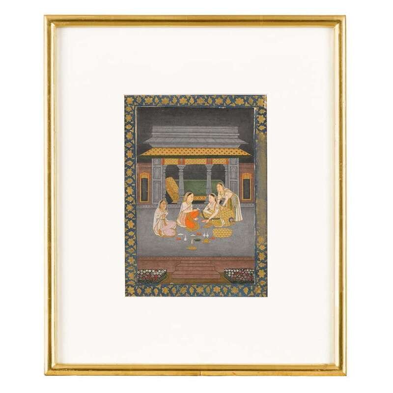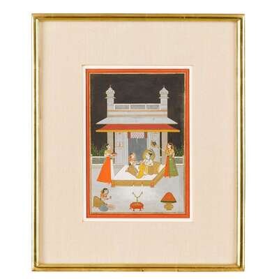 Comprising an illustration from the ragamala: bhairava raga depicting Vishnu being rubbed with sandal paste by female attendants, and a miniature depicting a maiden with her attendants seated before a pavilion at night. (2).