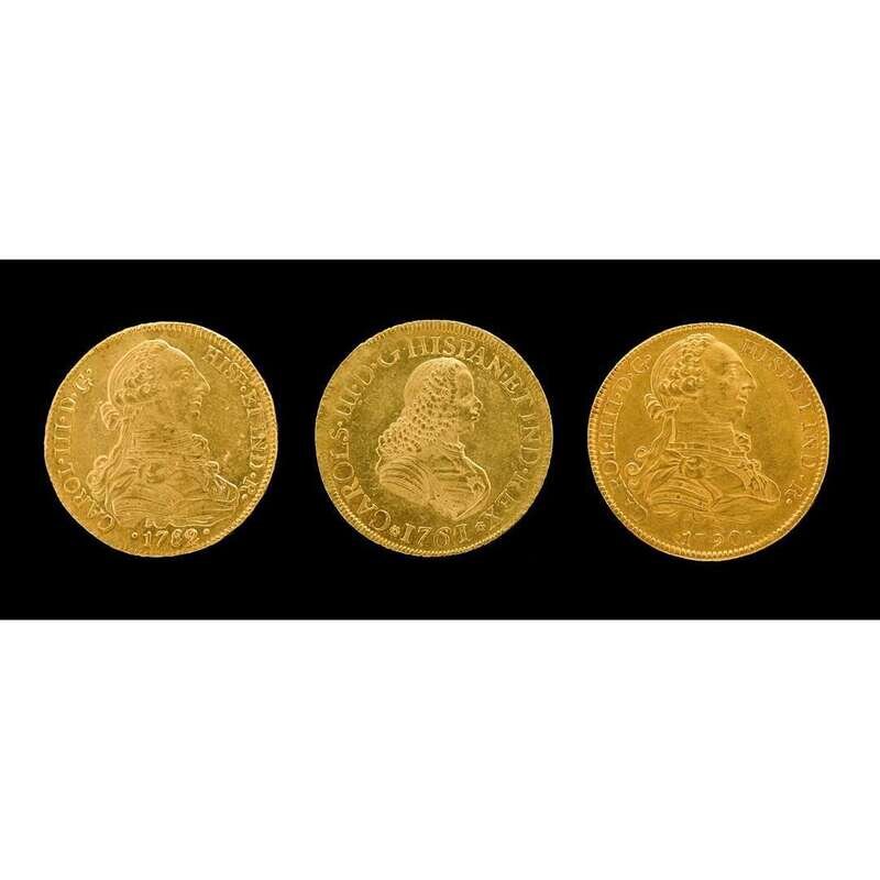 Three Mexican Eight Escudos gold coins Charles III, 1782; Charles III, 1761; Charles IIII, 1790