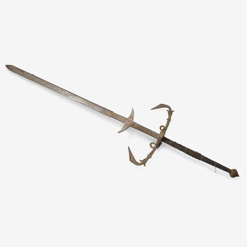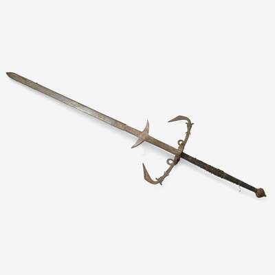 Straight double edged blade with rectangular ricasso issuing down turned side-lugs, the iron hilt with a pair of flattened quillons engraved with foliate scrolls and centered by a pair of fish heads issuing down-turned terminals curled in opposite directions, joined to further flattened and curved volutes, and engraved ring-guards, each filled with a plate, the wooden grip divided into five sections and studded with linear patterns of iron nails, bearing some remnants of original fabric covering, the plummet shaped pommel divided into six foliate sections and surmounted by a flattened button.
