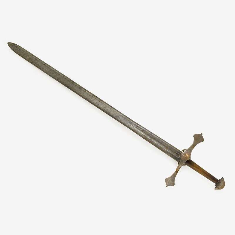 Straight tapering double-edged blade struck with an orb and cross mark and knight in profile to one side, the other with running wolf mark and similar knight, the iron guard with club form quillons and side ring.