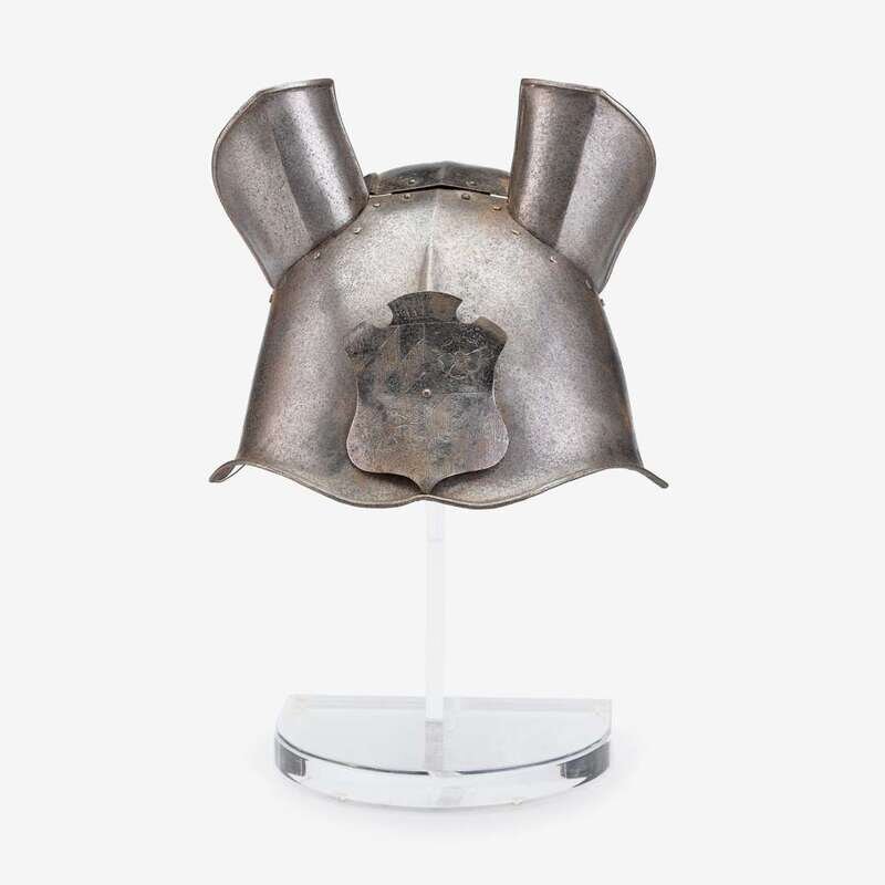 Steel, the main plate with hemispherical eye-covers and mounted with a shield form plaque engraved with an armorial, riveted to a frontal escutcheon, mounted on acrylic stand.