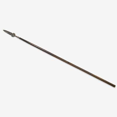 Narrow spearpoint blade with median ridge and cusped edge above an ovoid panel pierced with arrow heads and crescent moons, the socket molded with three stepped bands, joined to the later wood pole by elongated side straps.