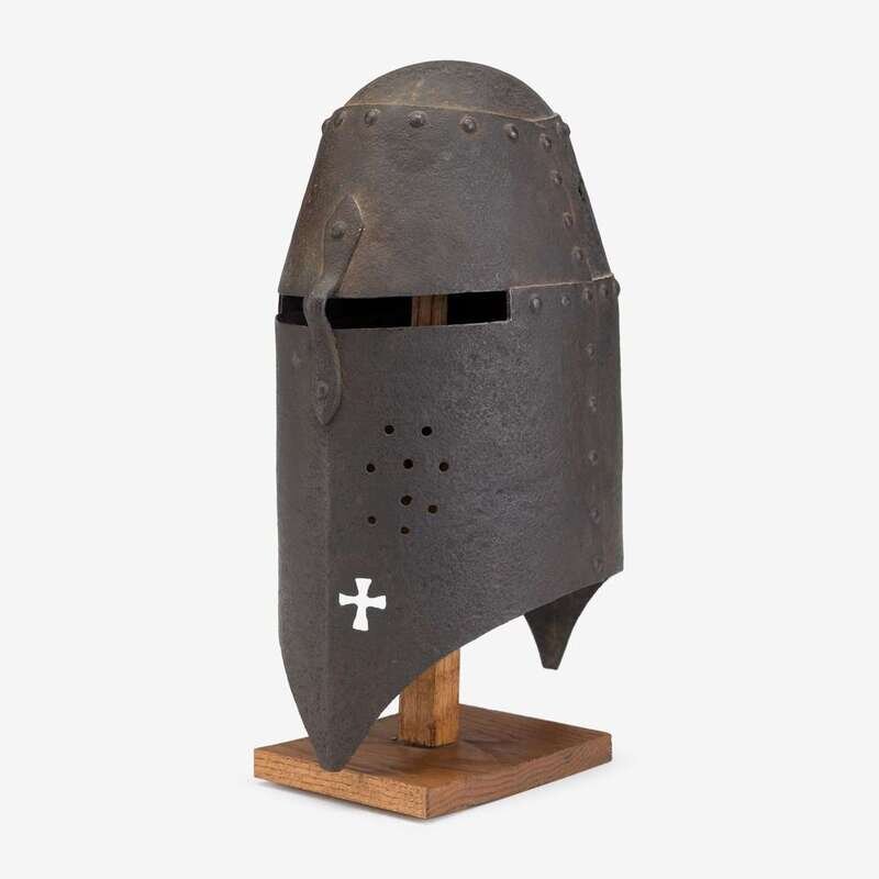 Rare copy of a medieval style iron helmet, composed of riveted iron plates stepped at the front to form a vision slit and pierced with a cross and circular breaths to one side.