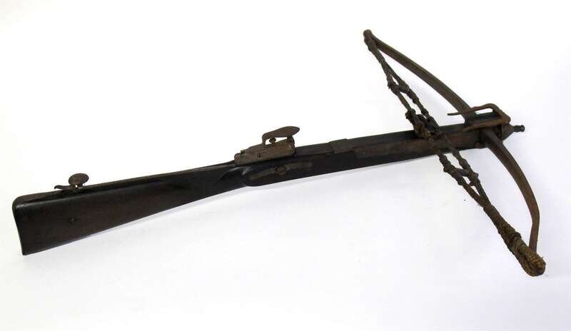 Iron bow with string cords, the walnut tiller with iron mounts and checkered grip.