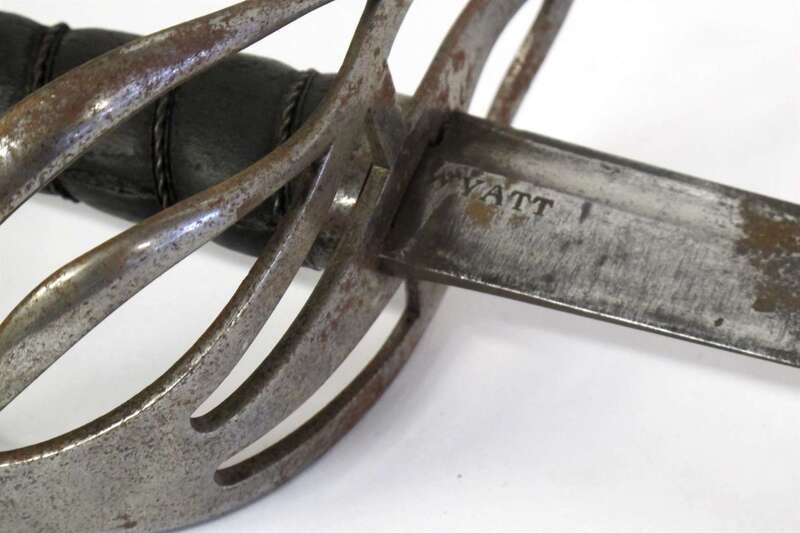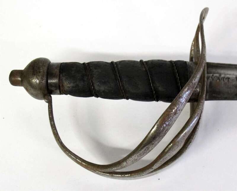 The curved and fullered blade engraved Wyatt to one side of forte, the steel hilt with four slot cross guard issuing two outswept bars joined to the side guard and wire wrapped leather grip terminating in hemispherical pommel with short button.