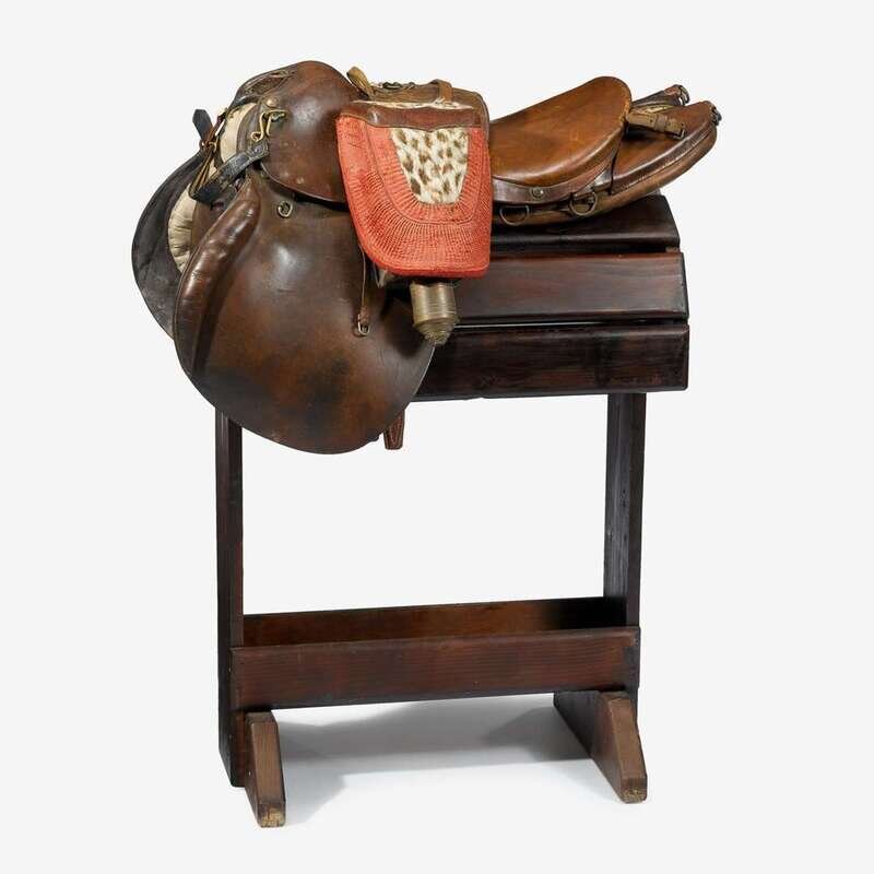 Leather saddle with detachable saddle holsters terminating in bronze caps constructed in a 19th century pattern, the faux leopard flaps with red trim.