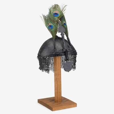 Domed steel skull fitted with adjustable nasal bar and two plume-holders, surmounted by a spike, suspending a shortened camail of riveted rings.