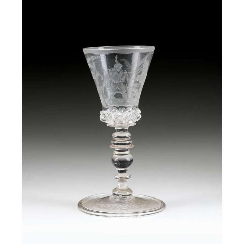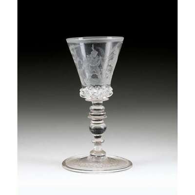 Finely engraved with a figurative scene depicting bear baiting, with two tiered vermicular collar, raised on tall multi-knopped stem and folded foot, with rough pontil mark.