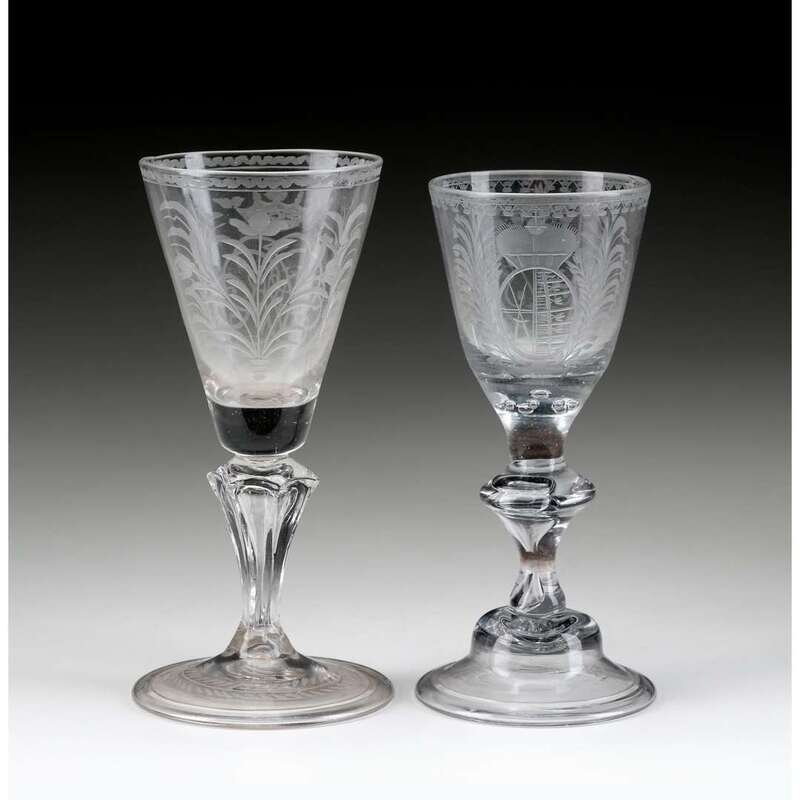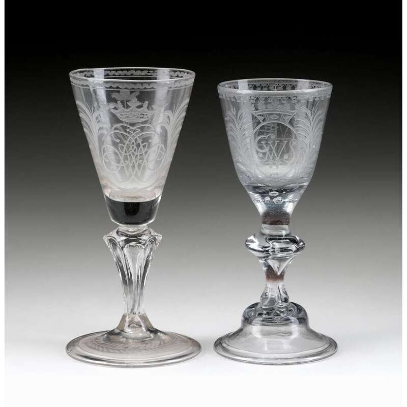 The larger engraved with crowned monogram flanked by palm fronds tied beneath, raised on silesian stem and folded foot, with rough pontil mark; the smaller with crowned monogram flanked by palm fronds tied beneath, opposite an oval shield, the tapered bowl with air beads, six around one, raised on inverted baluster stem and domed and folded foot, with rough pontil mark. (2).