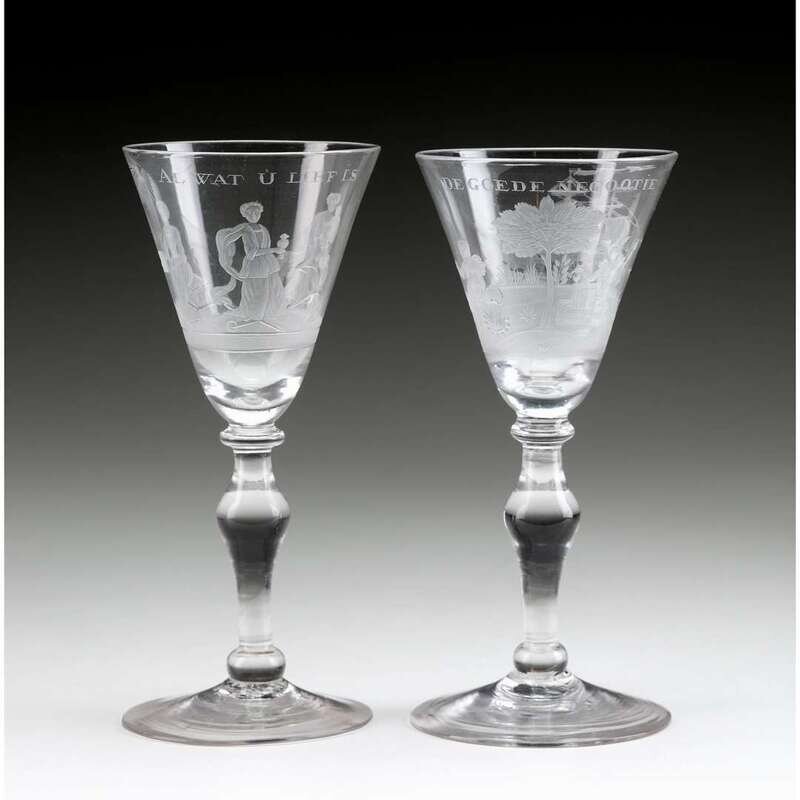 One finely engraved with inscription reading "Al wat ü lief is" above three allegorical female figures emblematic of faith, hope and charity, the other with inscription reading "de goede nego otie" above a three mast ship flanked by figures of Poseidon and Mercury emblematic of overseas trade, each raised on tall stem with disc knop above inverted baluster stem, each with rough pontil mark. (2).