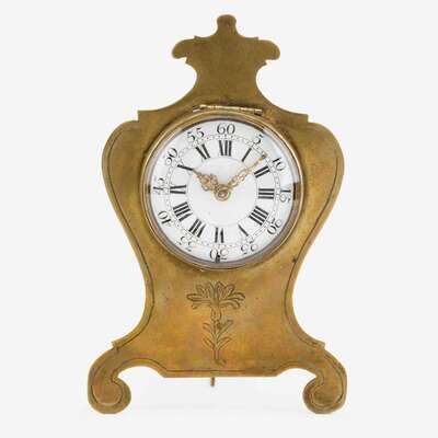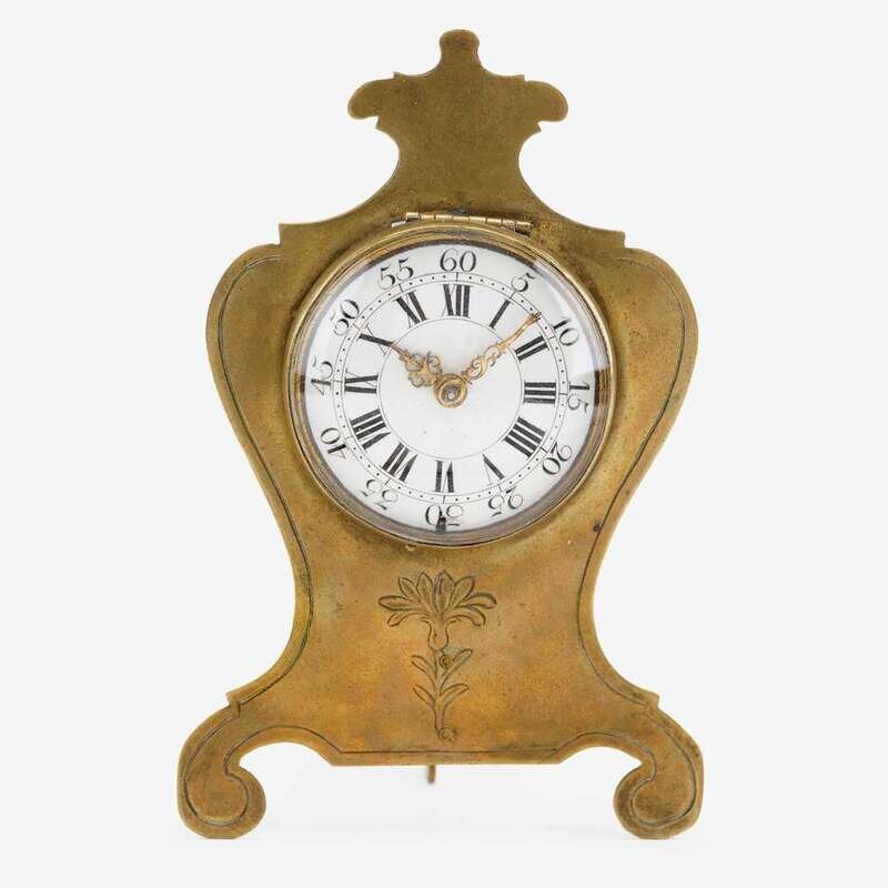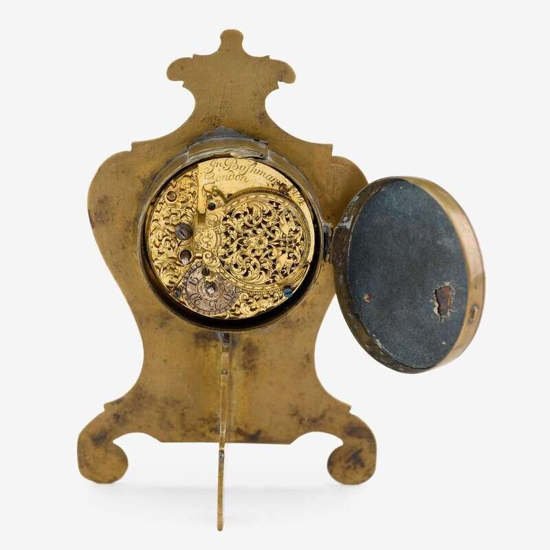 The gilt full plate movement inscribed "Jn. Bushman, London, 1474", with winged mask balance cock pierced with an arabesque centered by a mask below a pair of doves, the circular dial enameled with Roman hours and Arabic minutes, in waisted brass case.