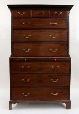 In two sections, the first with dentil molded cornice over three short drawers and three graduated long drawers flanked by fret carved corners, the second with brushing slide over three graduated drawers raised on bracket feet, the drawers all with cock beaded edges and original hardware.