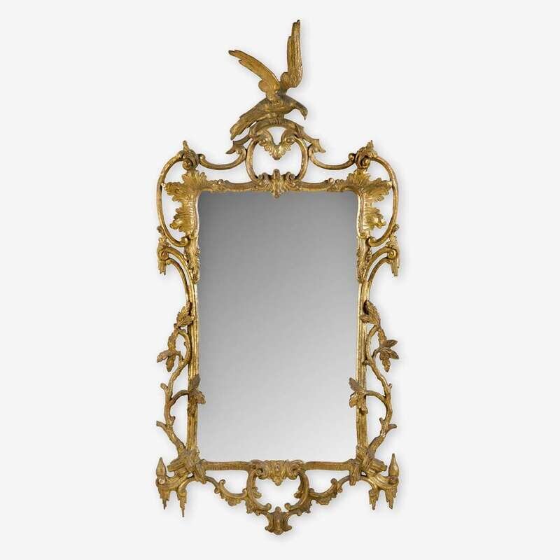 The later rectangular plate enclosed in an elaborately carved frame surmounted by a dove, over C-scroll and acanthus carved upper section and lower section carved to depict tree branches and leaves to either side over C-scrolls and icicles.