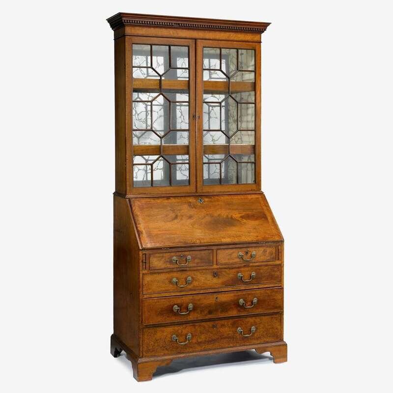 In two sections; the upper section with dentil molded cornice over two astragal glazed doors opening to a mirror backed and silk lined interior with 20th century alterations, the lower section with drop down tooled leather writing surface opening to a series of drawers and pigeon holes centered by a classical painting over two short and three graduated long cockbeaded drawers, raised on bracket feet; wired for electricity.