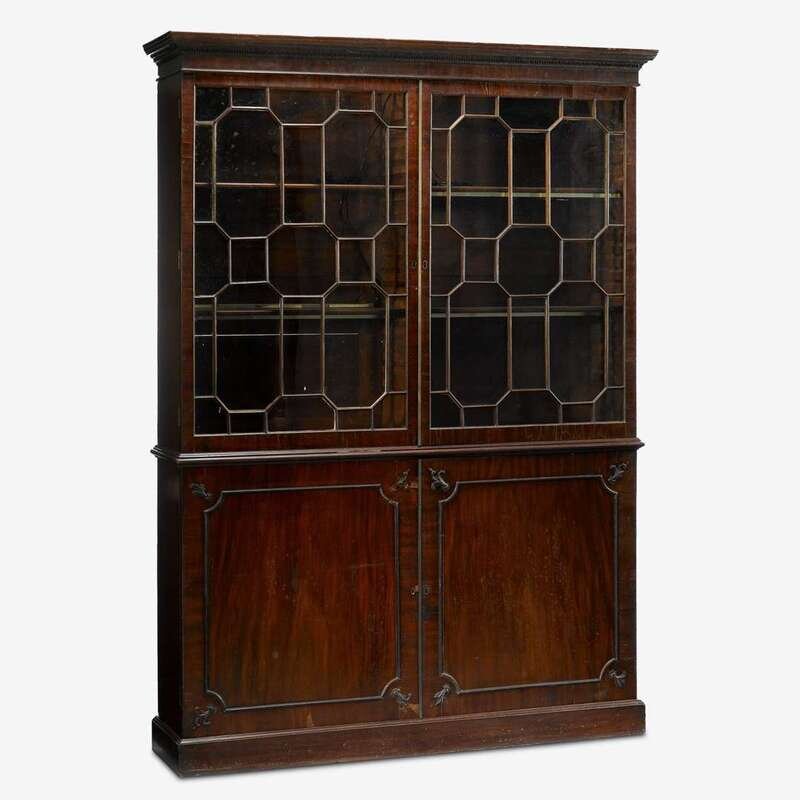 In two sections, the upper section with molded cornice over two astragal glazed doors opening to six shelves, the lower section with two paneled cupboard doors opening to a series of drawers and shelves, raised on a plinth base.