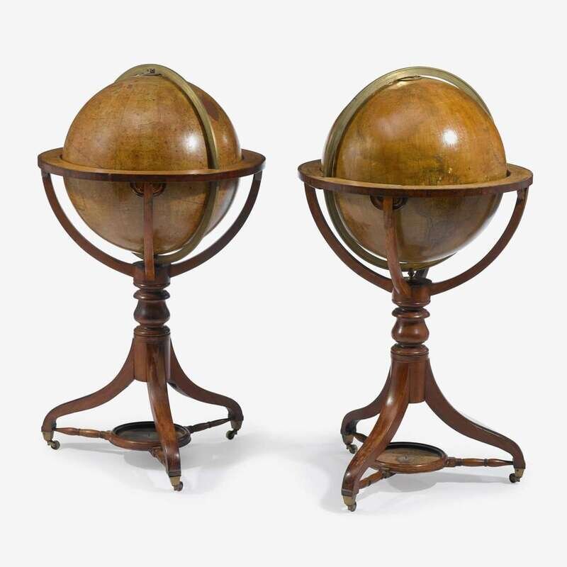 Comprising twelve engraved gores and two polar calottes, the terrestrial globe bearing the imprint: Malby's/ Terrestrial Globe,/ Compiled from the latest/ & most authentic sources/ including all the recent/ Geographical Discoveries./ Manufactured and Published under the superintendence of the/ society for the diffusion of useful knowledge/ by thos. malby & son/ map and globe sellers to the admiralty/ Jan. 1, 1850, engraved by Charles Malby; the celestial globe bearing the imprint: Malby's/ celestial globe,/ Exhibiting the whole of the/ stars/ Contained in the catalogues of Piazzi, Bradley, Hevelius, Mayer, La Caille, and Johnson/ the Double Stars from Sir W. Herschel & Struve/ reduced to the year/ 1850/ By Jno. Addison/ manufactured and published under the superintendence of the society for the diffusion of useful knowledge/ By Malby & Co./ Jan. 1 1848/ Houghton Street Newcastle Street Strand, above a retailer's label reading: T.W. Saunders 6 Charing Cross London, with brass meridian ring and hour dial, paper horizon ring, raised on turned support and outswept tapering legs joined by turned stretcher centered by circular compass terminating in brass casters. (2).