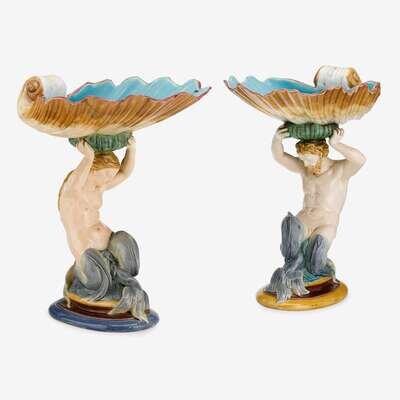 The shell form bowls supported on the heads of a merman and mermaid, each with bifurcated tail extending to each end of the oval base, each impressed Minton and with indistinct date cypher to base. (2).