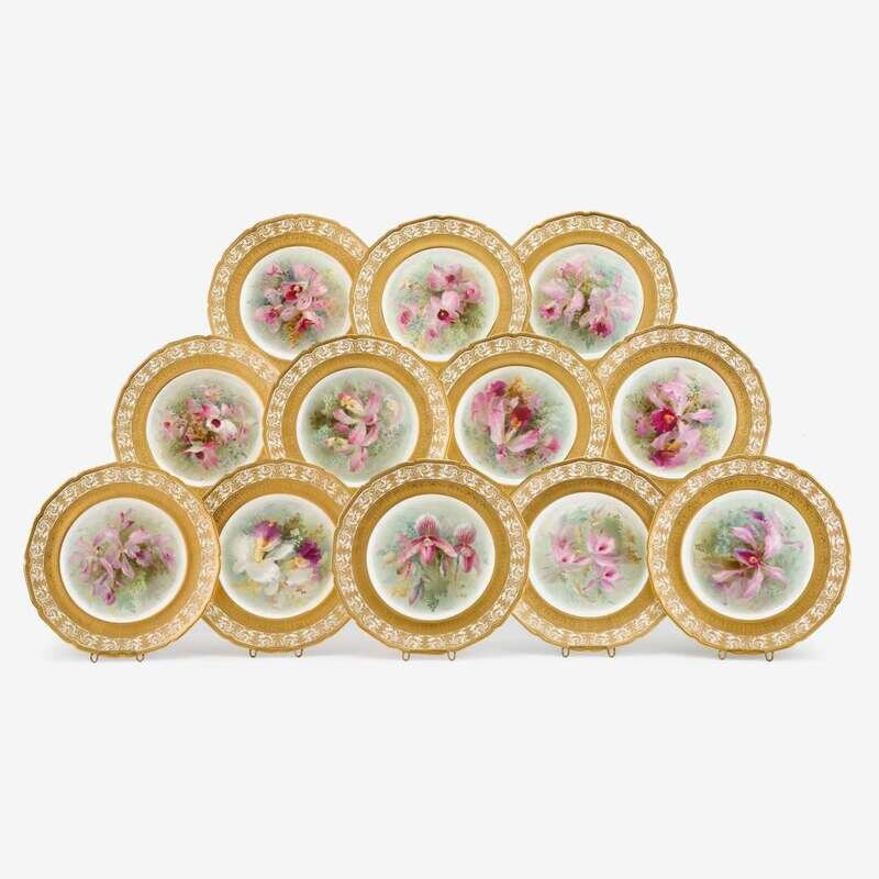 Each finely painted with a specimen orchid to the well and signed, within tooled gilt rims, the undersides titled in gilt, with Doulton mark and retailer's mark for Spaulding & Co. (12).