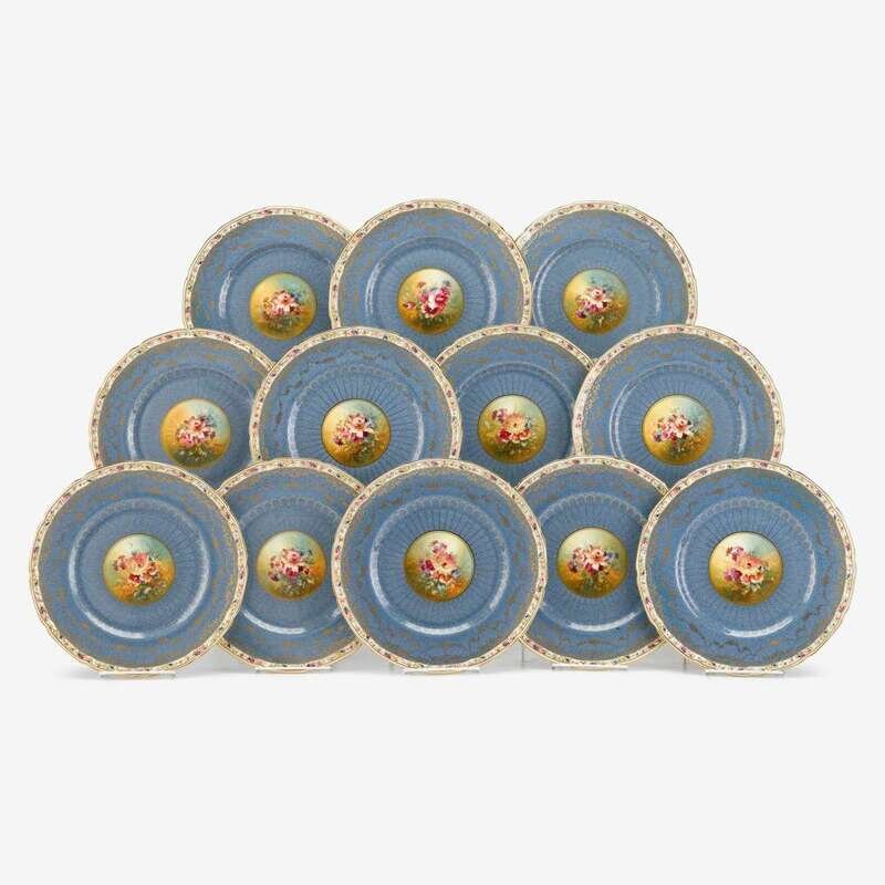 Finely painted to the center with a gilt edged roundel depicting a floral spray, most signed E. Wood, encircled by lobed radials against a powder blue ground, the shaped rim gilt with floral festoons and with foliate border against a yellow ground, with Royal Doulton marks and retailer marks for Bailey, Banks and Biddle, Philadelphia to the base. (12).