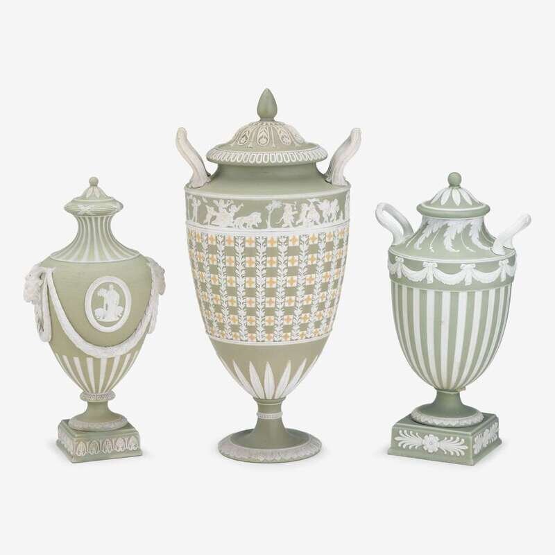 Comprising a large tri-color twin-handled urn applied with a border depicting bacchic putti, a smaller twin-handled urn with lambrequin border, and an urn applied with ram's heads suspending festoons draping below medallions to each side, each urn impressed Wedgwood to base. (3).