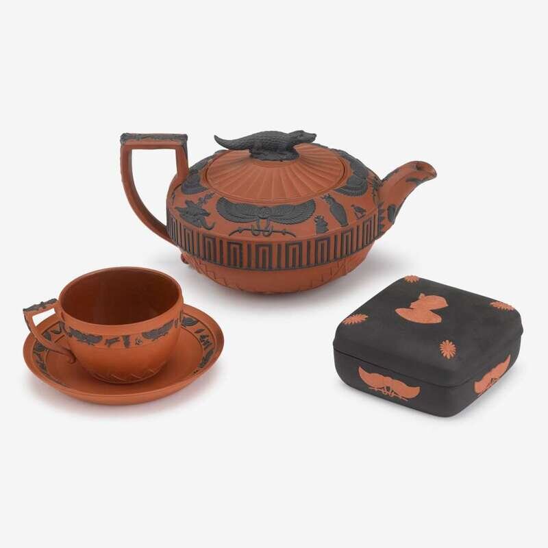 Surmounted by a crocodile finial to the cover, the compressed globular body with applied Egyptian motifs above a dentil border, impressed Wedgwood to base; together with a conforming teacup and saucer, and a black basalt covered box with applied Egyptian motifs. (3).