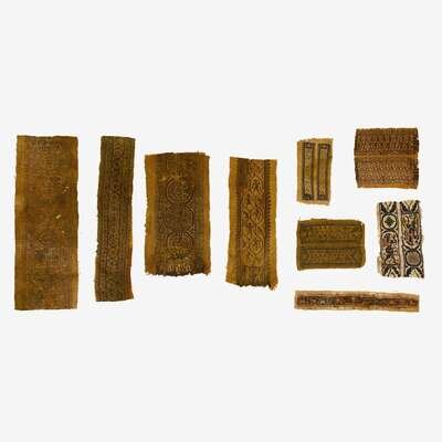 Including textile band fragments and panels woven with figures, animals and foliate designs, one polychrome woven to depict dancing figures within arcade, another woven in red with pairs of birds. (9).
