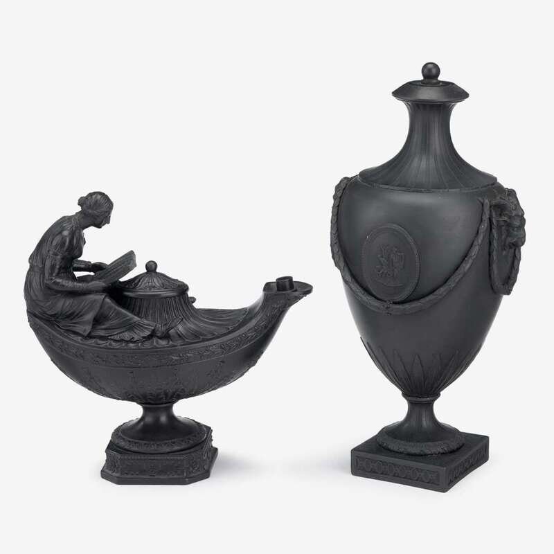 Typical neoclassical form, the oil lamp surmounted by a figure of a woman reading, impressed Wedgwood to base; the urn and cover of typical form, molded with ram's heads suspending festoons supporting medallions to each signed, impressed Wedgwood to base. (2).