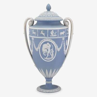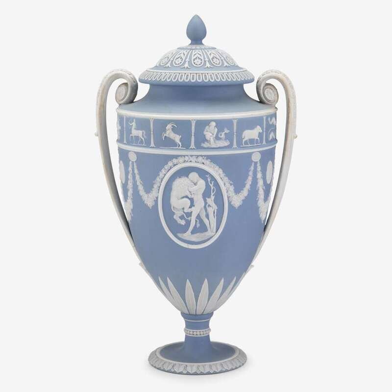 Tapering form, mounted with twin volute handles, the pale blue body applied with festoons and medallions depicting Hercules wrestling the Nemean lion opposite an image of Hope resting on an anchor all beneath a segmented frieze depicting various creatures from the labors of Hercules, surmounted by cover, impressed Wedgwood to base.
