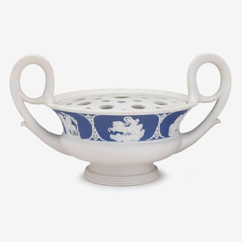 Kantharos form with two high loop handles, encircled by dark blue border applied with six reliefs depicting classical and mythological figures, surmounted by pierced lid and interior cover, the base with Wedgwood and comma mark.