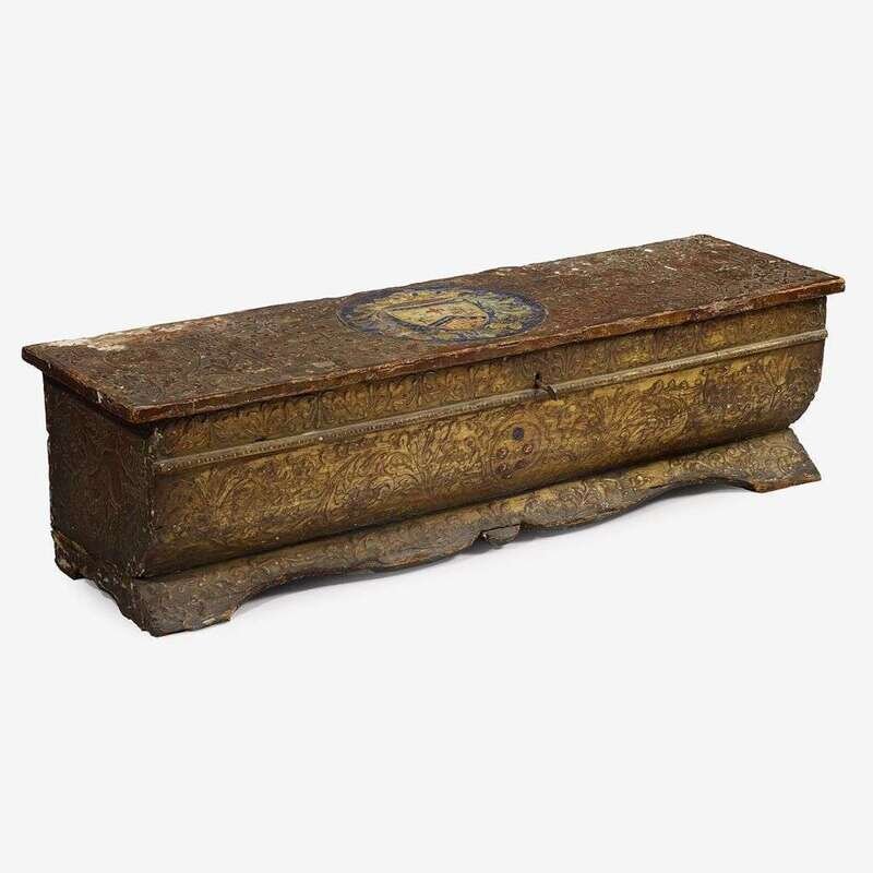 The planked rectangular top centered by an armorial incorporating a shield with two rampant lions and the fleur-de-lis of Florence, surmounted by a crown and surrounded by leafy scrolls, the top further decorated in pastiglia to show raised scrolls and an armorial rampant lion at one end and an eagle at the other, the front centered by the Medici armorial depicting five balls in orle gules, the sides further decorated in pastiglia to show scrolls and figures, on shaped plinth base.