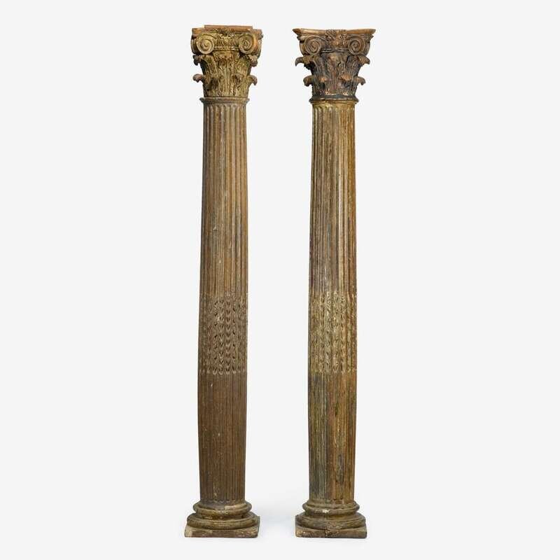 Pair of monumental Italian carved wood corinthian columns 18th century