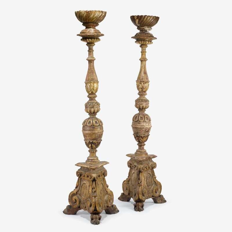 Pair of monumental Italian Baroque style carved parcel gilt giltwood torcheres early 19th century