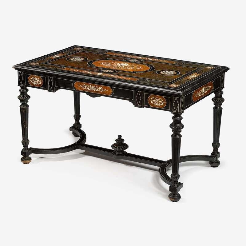 The rectangular inlaid top centered by a satyrs mask issuing foliate scrolls surrounded by circular and lozenge reserves geometrically inlaid in four quadrants, surrounded by geometric border similarly inlaid, over single frieze drawer, the sides similarly inlaid, raised on fluted tapering legs united by curule stretcher centered by gadrooned urn.