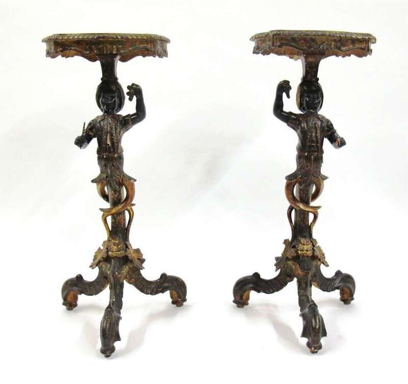 The shaped and painted top with gadrooned edge raised on carved, gesso, and painted blackamoor figure issuing three downswept legs terminating in toupie feet. (2).