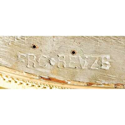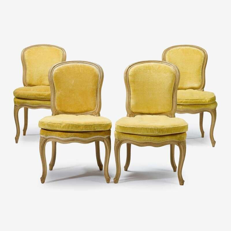 The channel molded frame enclosing a padded back over stuffed cushion seat, raised on scroll carved cabriole legs, two chairs stamped "FRC. REVZE" to underside of seat rail. (4).