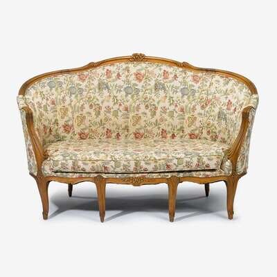 The foliate and channel carved frame enclosing padded back over stuffed cushion seat, raised on scroll carved tapering cabriole legs.