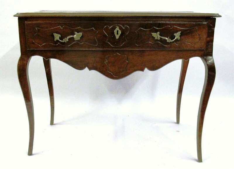 The serpentine rectangular top with molded edge over single drawer and shaped apron, raised on cabriole legs.