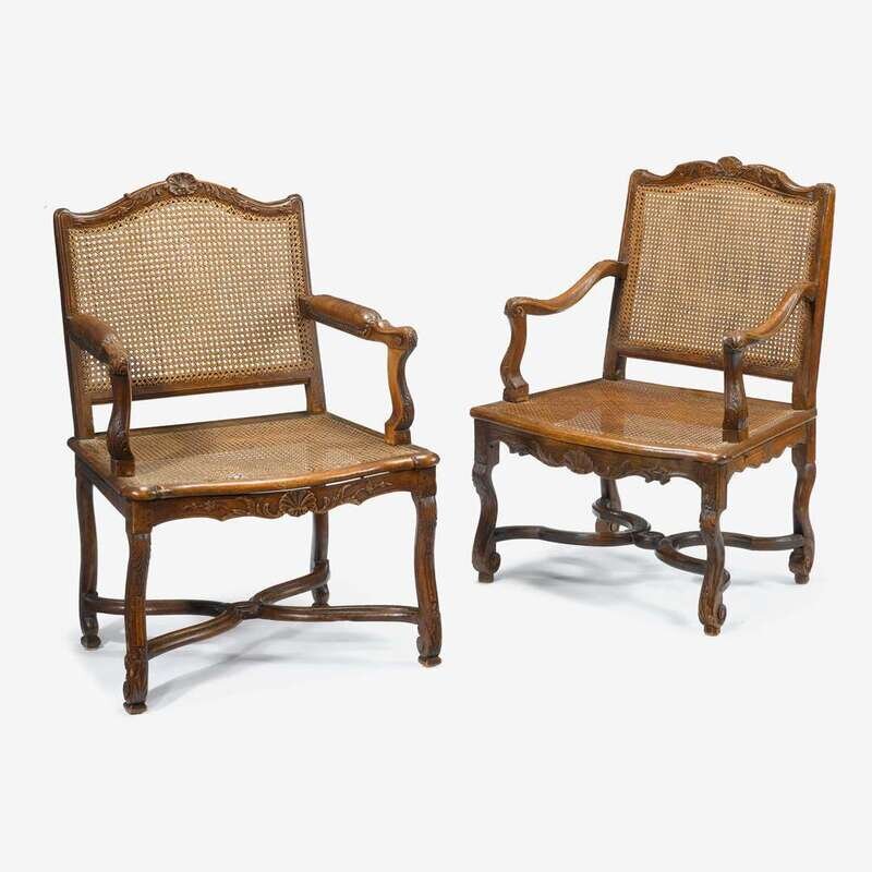 Matched pair of Louis XV carved walnut and cane upholstered fauteuils 18th century