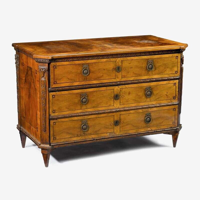 The rectangular top with banded edge over egg and dart carved frieze and three double panel inlaid long drawers, flanked by canted angles carved to show a ram's mask holding a ring hung with bellflowers, raised on square tapering legs.