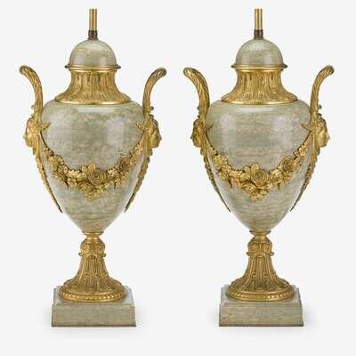 Surmounted by a domed cover, the tapering ovoid body mounted with twin handles issuing from masks and suspending festoons, raised on ormolu socle and marble plinth, wired as lamps. (2).