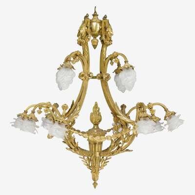 The corona with pine cone drop-finial issuing an upper tier of four arms each with frosted flame shade, over a lower tier of eight lights in four pairs issuing from a central torch, mounted with ram's head masks, laurel swags and bows, wired for electricity.