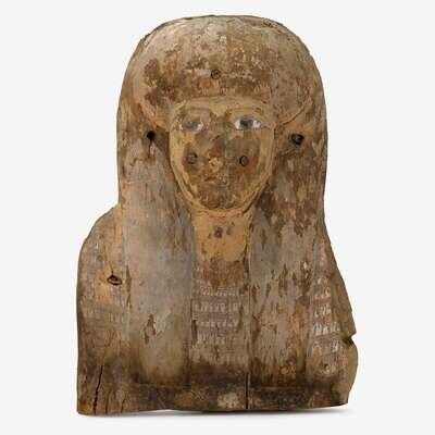 Egyptian polychrome painted carved wood mummy mask Probably Late period, 716-30 B.C.