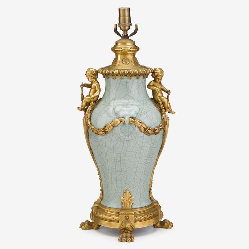 Baluster form, the celadon ge-type jar with integral mask and ring handles issuing ormolu swags held by seated putti, with conforming collar and base, all raised on four lion paw feet, mounted as a lamp.