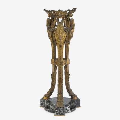 Tripod form, the circular top with central recess joined to acanthus and scroll mounts, all above ram's head tripartite base terminating in hoof feet and joined at the center by a laurel frieze, raised on verde antico base.