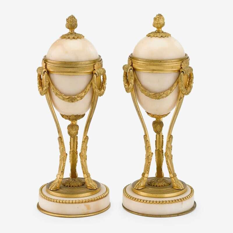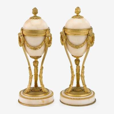 Oviform, the reversible cover with gilt socket opposite domed marble cover with gilt finial, the body with ormolu mounts suspending three loose rings joined by festoons and raised on tripartite supports terminating in paw feet, on marble base centered by a bronze paterae and mounted with a beaded border. (2).
