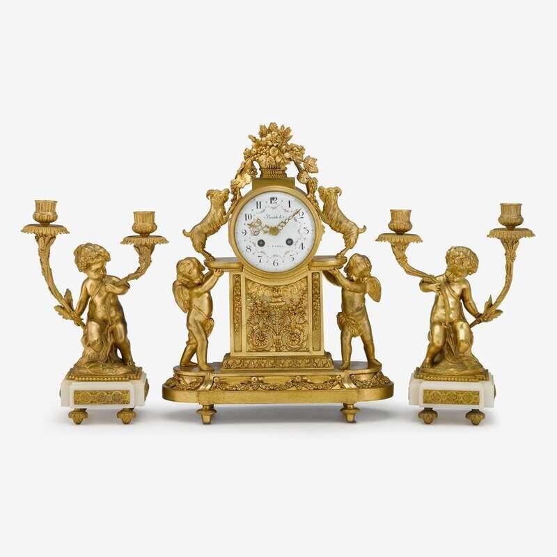 Circular dial with Roman hours enameled Boudet a Paris, raised on a pedestal flanked by putti and rams and surmounted by a fruit filled basket, the movement with pastille marked Medaille D'Argent Vincenti 1855, the conforming candelabra cast with Bacchic putti standard issuing twin candlearms and raised on a white marble base. (3).